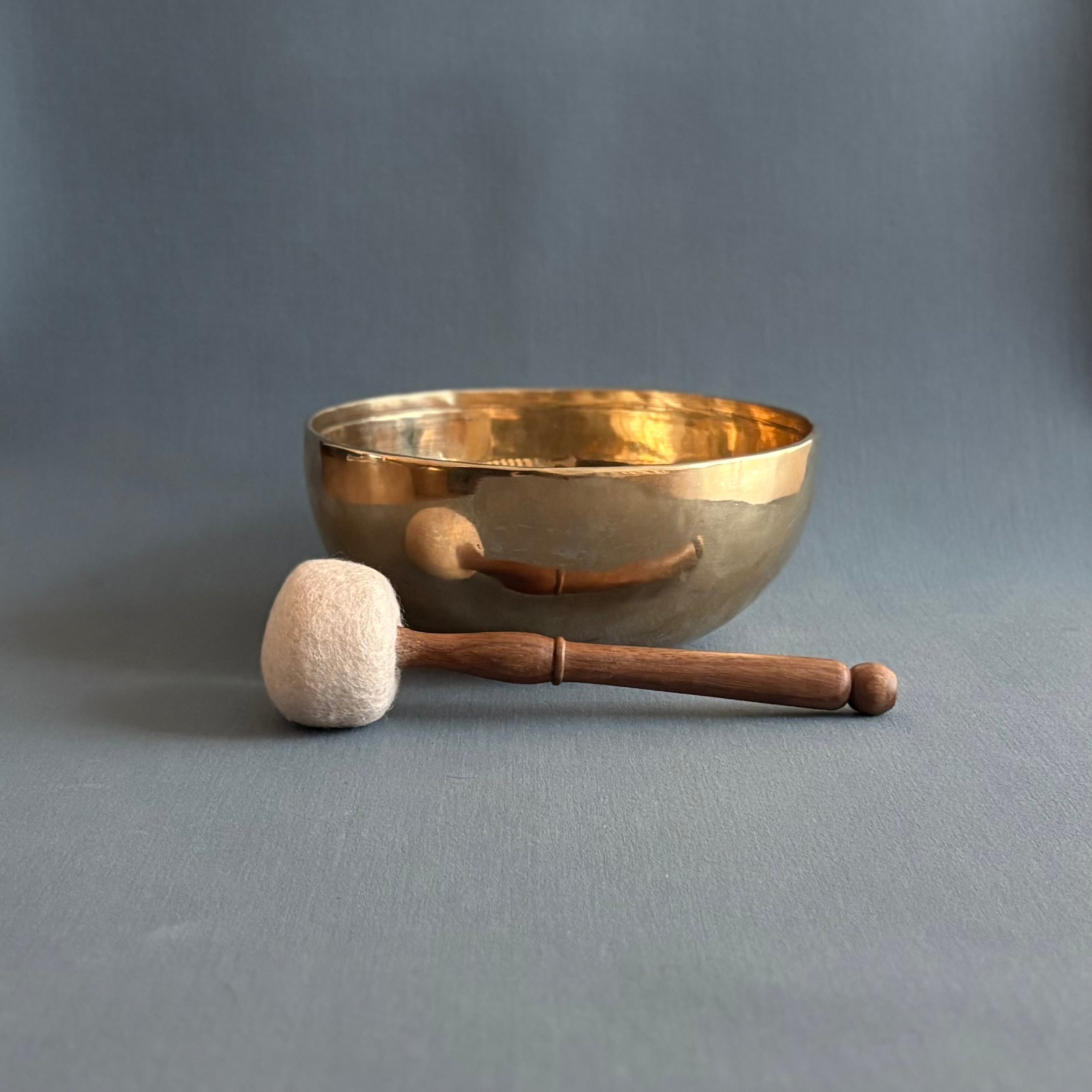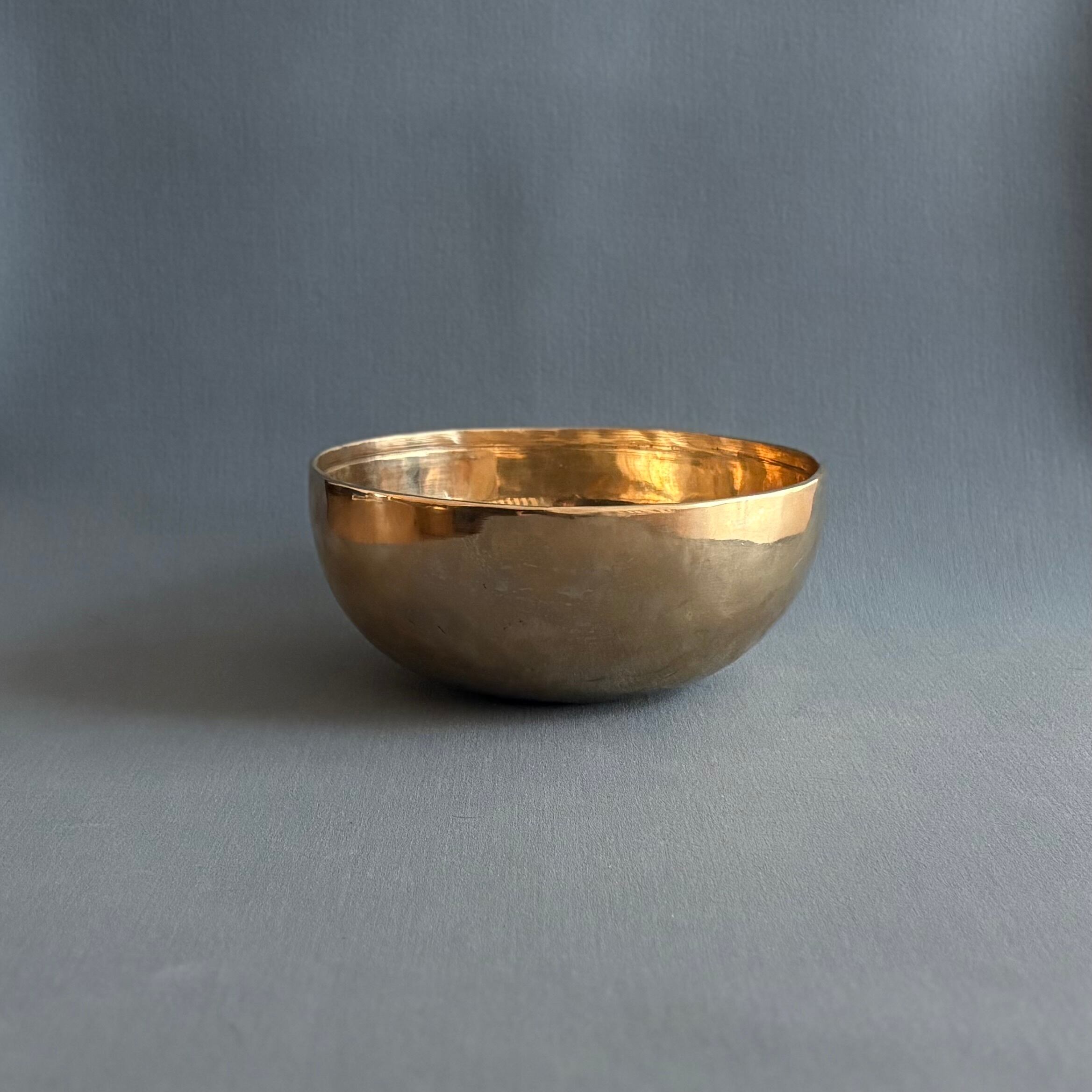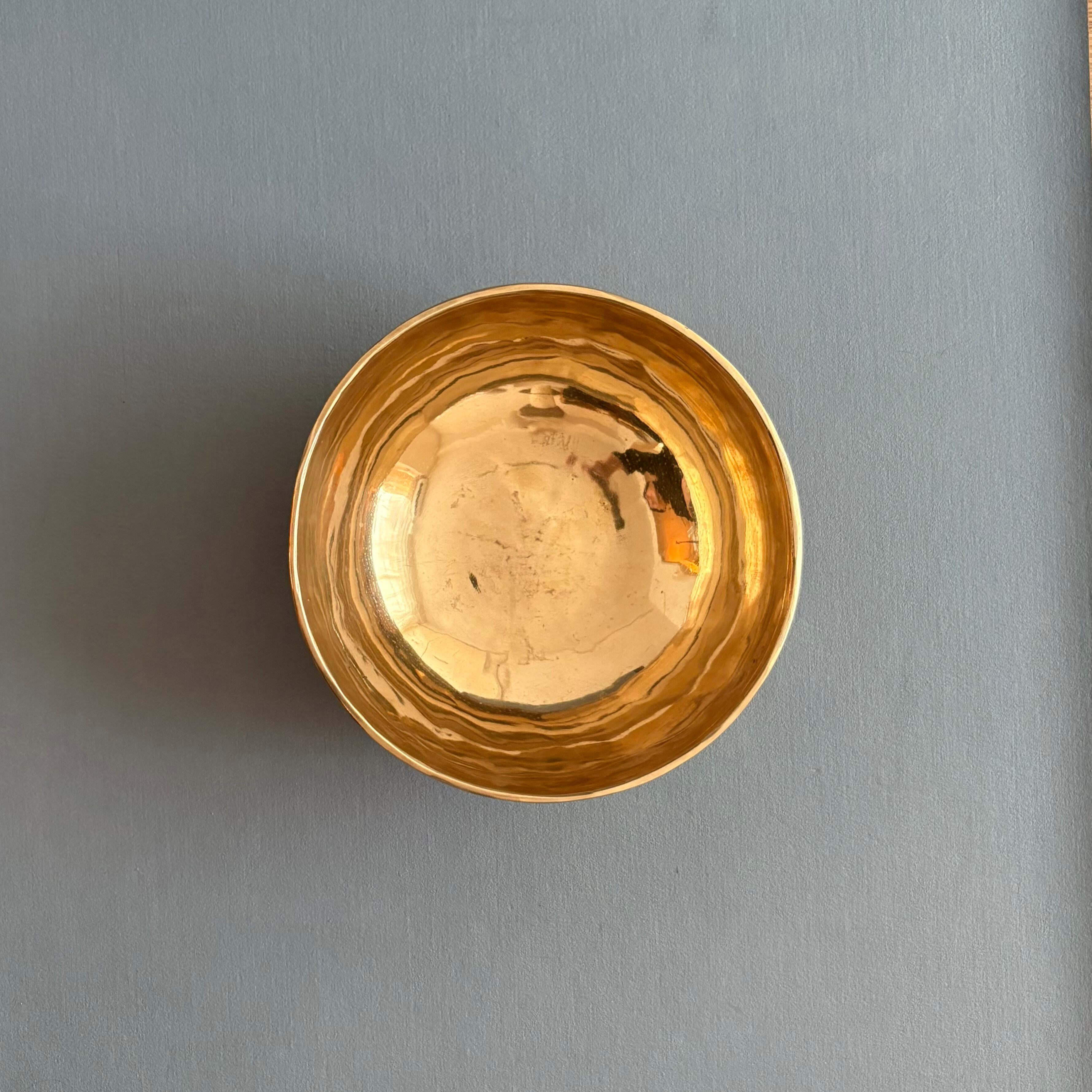 輝きと、反射の強いゴールド色の美しいシンギングボウル。